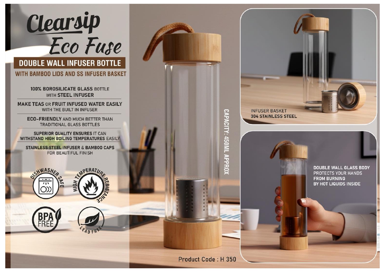 The Clearsip Eco Fuse 450ml Double Wall Glass Infuser Bottle is designed for those who enjoy healthy and refreshing beverages. Made from high-quality borosilicate glass, it offers excellent durability and resistance to high temperatures.